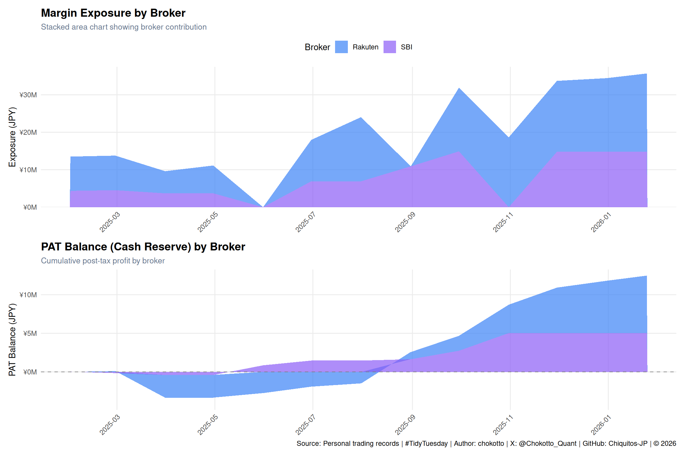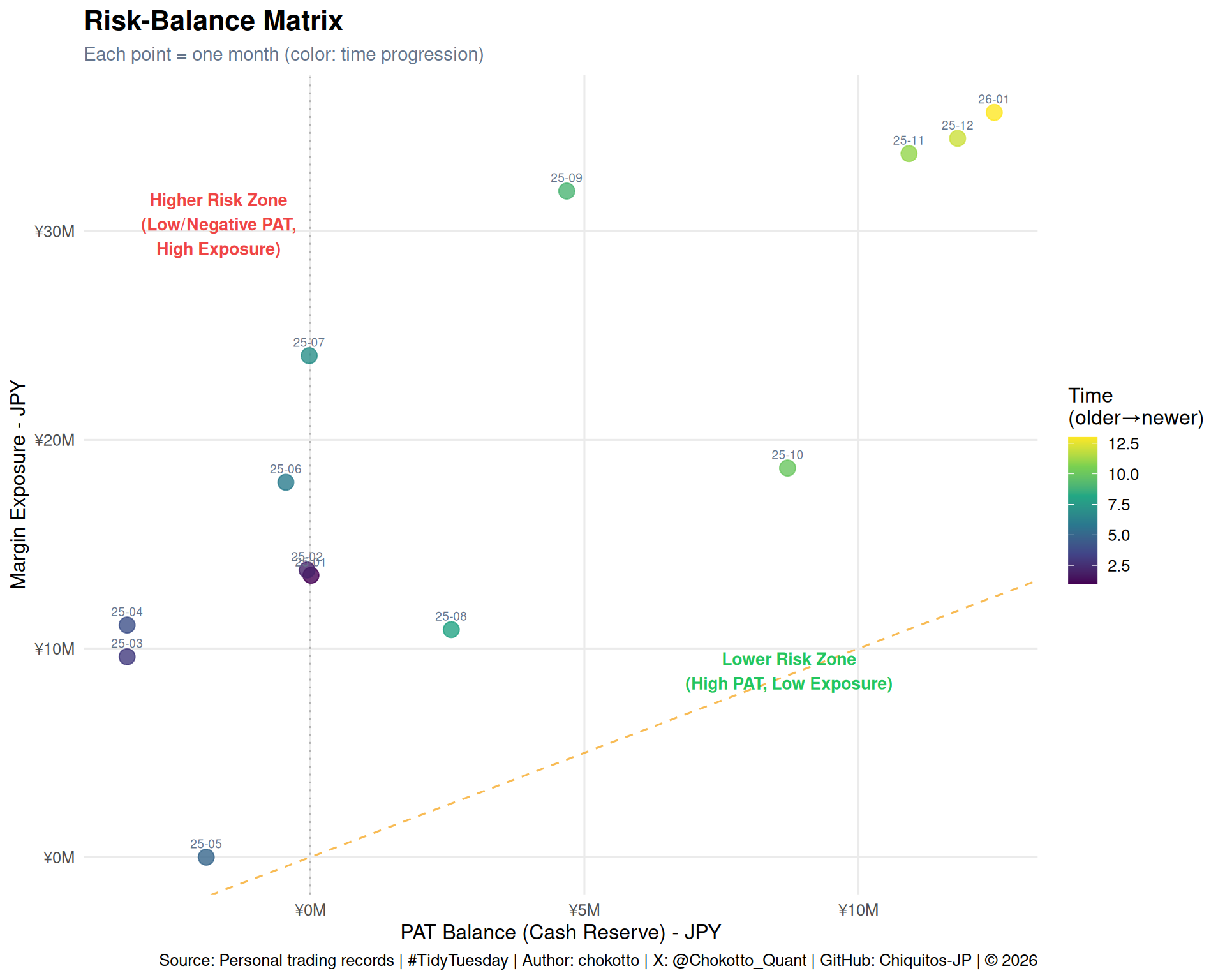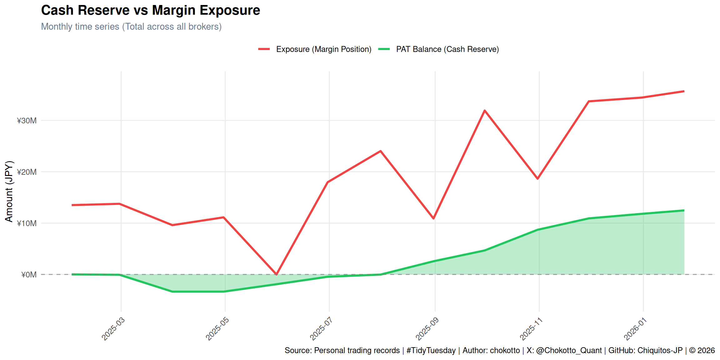 This week's TidyTuesday visualizes the relationship between **Cash Reserve** (cumulative post-tax profit) and **Margin Exposure** (open margin positions) from my personal trading accounts.