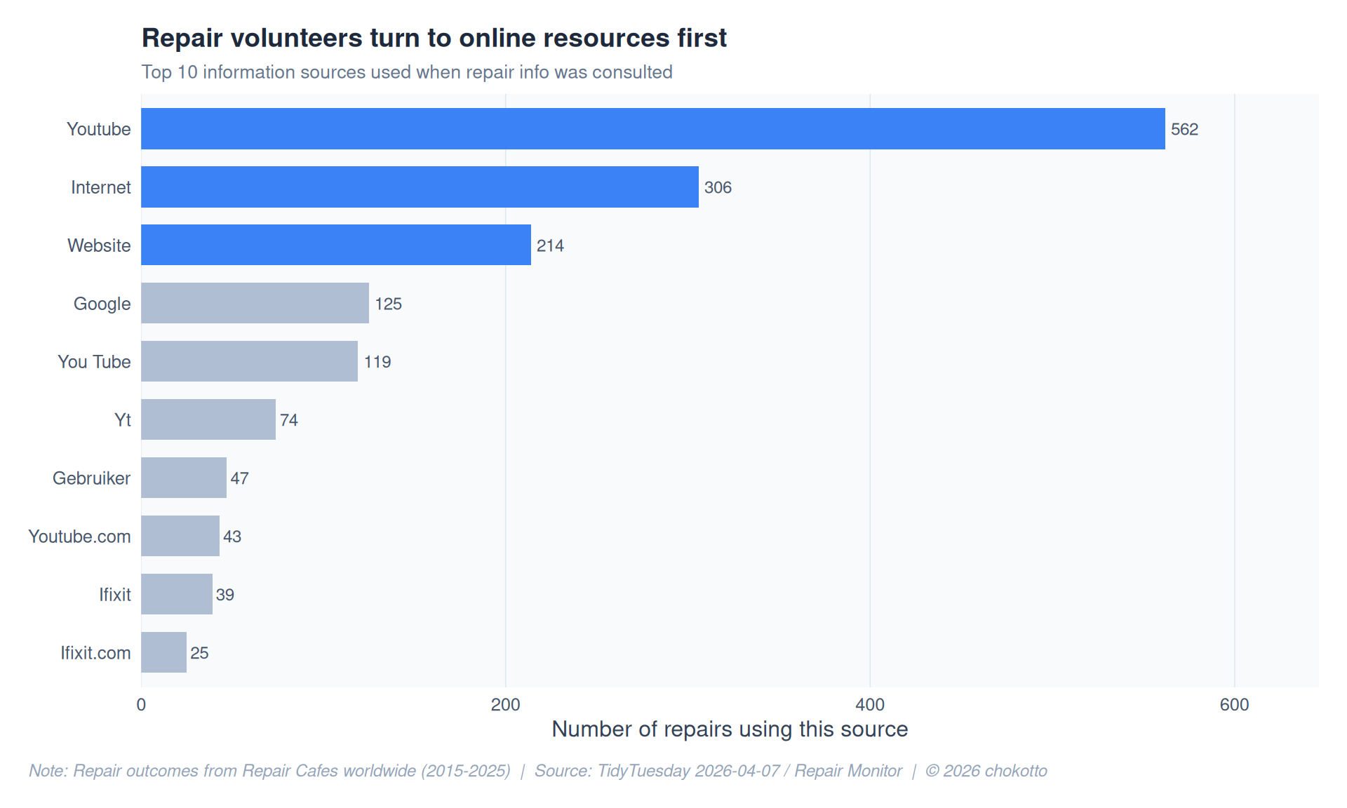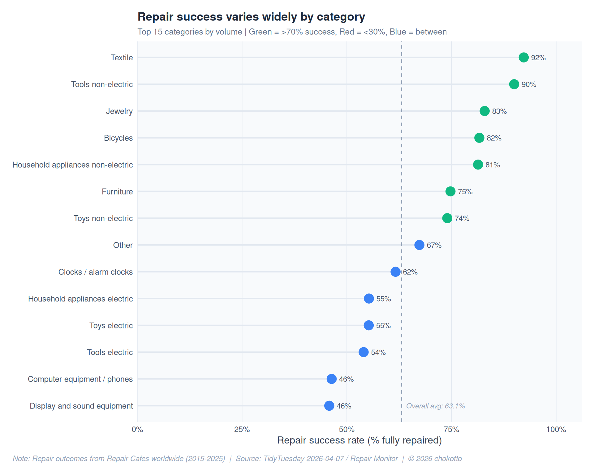 Repair Cafes are free community events where volunteers help people fix broken items – from electronics and clothing to furniture and bicycles. This dataset captures over 200,000 repair attempts across 40+ countries, tracked by the Repair Monitor platform. We explore which product categories are most repairable, how the movement has grown geographically, the distribution of repairability scores, and what information sources repair volunteers rely on.