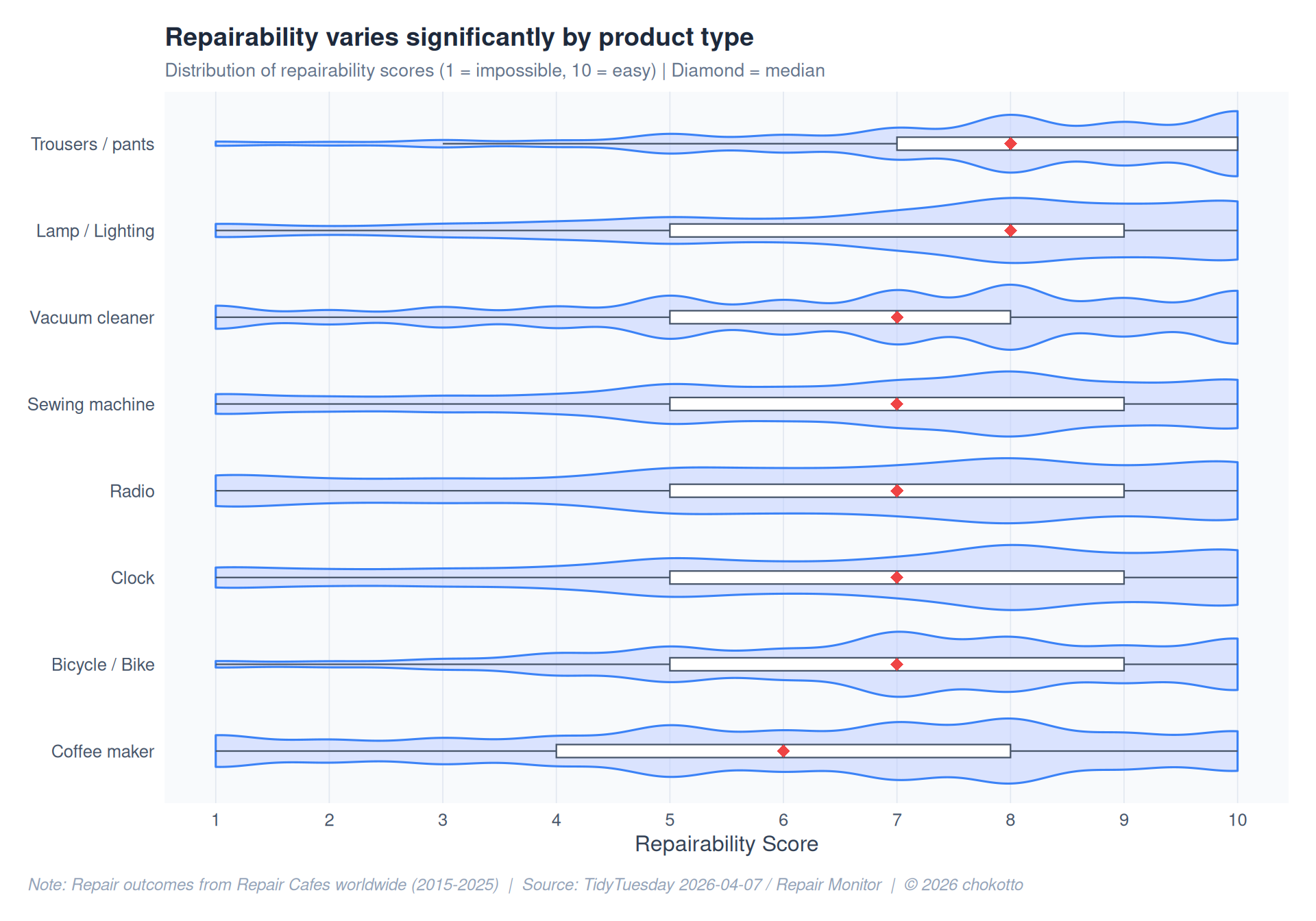 subtitle = "Distribution of repairability scores (1 = impossible, 10 = easy) | Diamond = median",